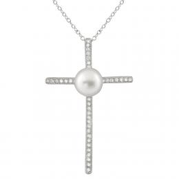 Sterling Silver Micropave Cubic Zirconia & 8-8.5mm Pearl Crucifix