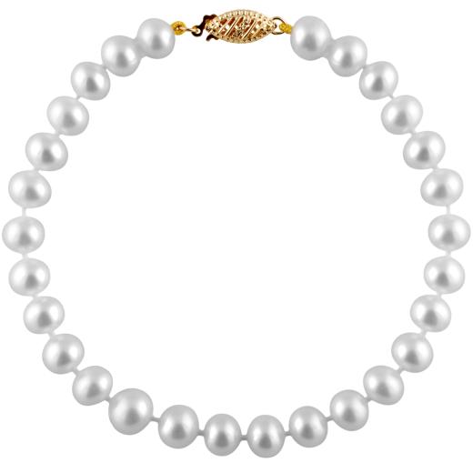 This lovely bracelet features a lustrous stand of freshwater pearls. Each pearl is individually knotted into place and measured 6-6.5mm. This bracelet has a 14k yellow gold clasp and is 7.25".