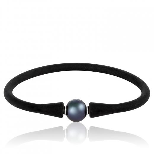 Featuring a sleek black silicone band that comfortably hugs the wrist, this bracelet is accented with lustrous black freshwater pearls that add a touch of refined elegance. The striking contrast between the smooth, modern silicone and the timeless beauty of the pearls creates a piece that is both bold and sophisticated.