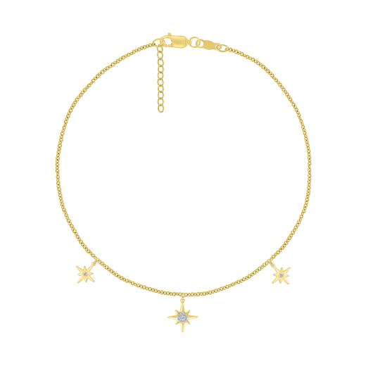 Radiate celestial elegance with the Bella Moda 10K Yellow Gold Diamond Star Anklet. Crafted from lustrous 10-karat gold, delicate diamond-studded stars adorn its length, twinkling like the night sky. Effortlessly elegant, this anklet adds a touch of celestial charm to any look, whether paired with heels or a barefoot stroll along the shore.