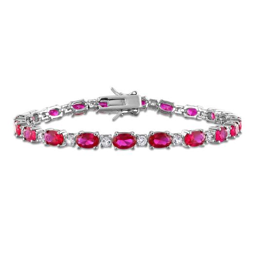 Indulge in timeless elegance with our breathtaking 14ct TGW Created Ruby and Created White Sapphire Tennis Bracelet in Sterling Silver. Each gemstone, meticulously crafted, exudes a captivating brilliance and allure. With a length of 7.25 inches, this bracelet offers a comfortable and secure fit, perfect for showcasing its radiant beauty. Elevate your ensemble with this exquisite accessory, a symbol of sophistication and luxury that will surely turn heads wherever you go.
