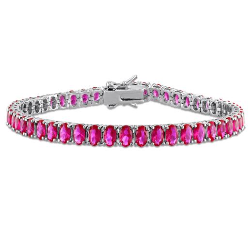 This stunning tennis bracelet features a remarkable 25 carat total gem weight of created rubies, elegantly set in sterling silver. With a length of 7.25 inches, it exudes a vibrant and sophisticated allure, adding a touch of elegance to any ensemble. The deep red hue of the created rubies against the sterling silver setting creates a captivating and timeless piece.