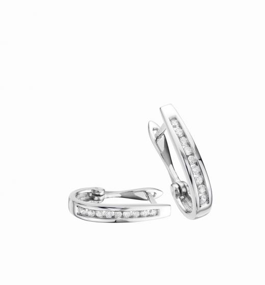 Round diamonds are channel set in beautiful hoops of 10k white gold. The earrings have a total diamond weight of .50 carats with secure hinged backings