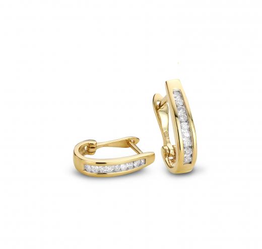 Beautifully matched round diamonds are elegantly channel set in hoops of 10k yellow gold. These .75ctw earrings are secured by hinged backings