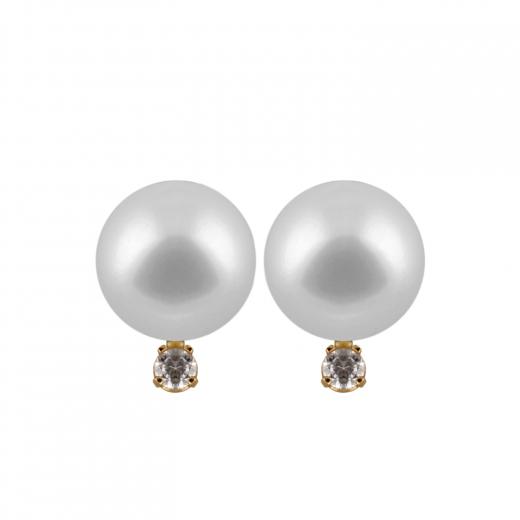 White cultured salt water 5-5.5mm pearls are set in 14k yellow gold are simply elegant in these earrings for her. Single round diamonds provide the finishing touch to each earring