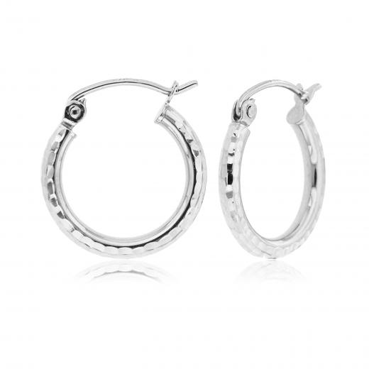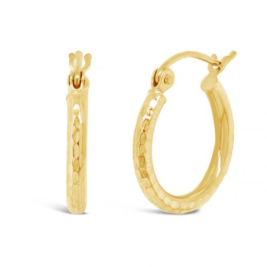 The intricate diamond-cut detailing adds a radiant shimmer to the classic hoop silhouette, creating a versatile accessory that seamlessly transitions from day to night. Effortlessly chic, these earrings are a stylish staple for any occasion, exuding a refined and polished look.