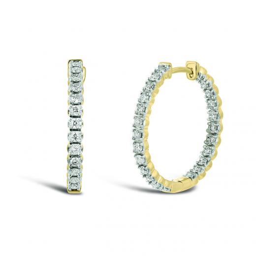 Sparkle from every angle with these inside out hoop earrings. Radiant with 1.00ctw of spectacular round diamonds, each earring is set with a row of diamonds along the front edge as well as a row of diamonds on the inside back edge. These beauties are fashioned in 10kt yellow gold, polished to a brilliant luster and are secure with hinged click backs.
