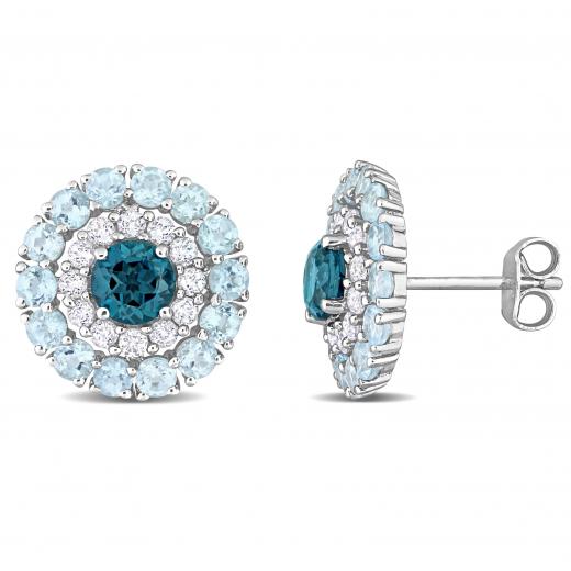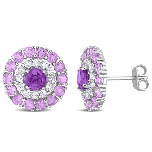 These exquisite double halo stud earrings are crafted in lustrous sterling silver. These enchanting earrings feature two prong-set, African-amethyst gemstones placed at the centre. The main stone is surrounded by 24 prong-set white topaz gemstones and 28 prong-set amethyst gemstones. Polished to a brilliant shine, these classy earrings are sure to give you a simple yet captivating look.