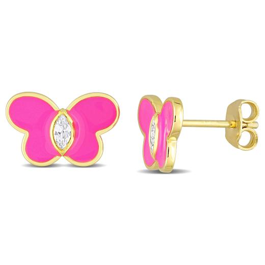 These charming butterfly enamel stud earrings are crafted in lustrous yellow plated sterling silver and feature two round-cut bezel-set created white sapphire gemstones studded at the center of butterfly design on pink enamel. Polished to brilliant shine, these flickering earrings are the valuable addition to any jewellery collection. The perfect finishing touch to your child's outfit, these adorable earrings are stylish addition to any look.