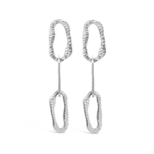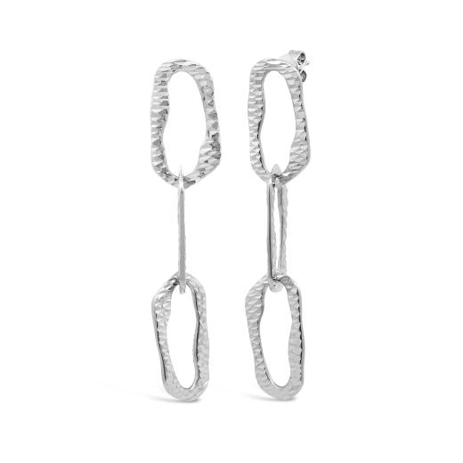 These striking drop earrings feature hammered sterling silver links that create a textured, modern look. The bold design and reflective finish catch the light with every movement, adding a dynamic and sophisticated touch to any outfit. Perfect for those seeking a statement piece with a touch of artistry.