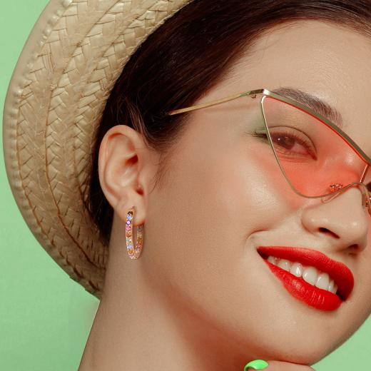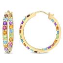These vibrant multi-coloured hoop earrings are crafted in yellow plated sterling silver and feature 40 round-cut, prong-set blue and pink topaz, peridot, garnet, amethyst and honey citrine gemstones in a delicate rainbow inspired hoop earrings design. With exquisite luster and a brilliant shine, these gemstone earrings are sure to make a standout addition to any jewelry collection.