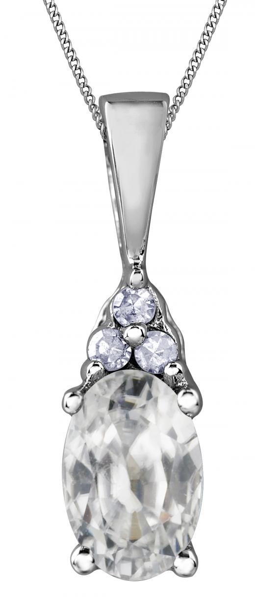 This attractive pendant features an oval cut White Zircon accented by shimmering diamonds. This birthstone pendant is set in 10k gold and enhanced with a high polish finish. White Zircon is the April birthstone, making this pendant the ideal choice as a birthday gift, or adding a touch of class to your own jewellery collection.