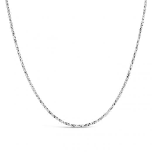 An 18-inch 10K White Gold Corena Chain, delicately slender at 0.90mm, offers a refined simplicity. Its understated elegance makes it a versatile piece, perfect for highlighting pendants or standing alone with subtle sophistication.
