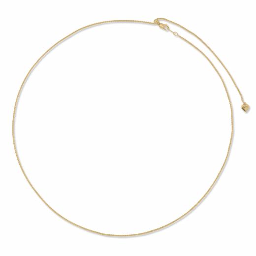 The 10K Yellow Gold Adjustable Wheat Chain, capable of adjusting up to 22 inches and measuring 0.80mm in width, is a delicate and versatile accessory. Crafted from 10-karat yellow gold in a wheat chain style, it offers a subtle yet elegant look that complements various styles and outfits due to its adjustable length.