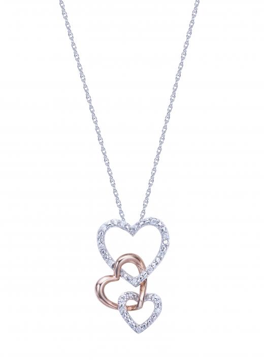 This enchanting necklace features a trio of hearts in sterling silver. Two of the heart gleam with sparkling round diamonds. The pendant is suspended from an 18" chain with secure clasp and has a total diamond weight of 0.10 carats.