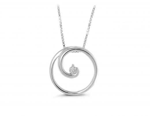 A single scintillating diamond is the focal point of this delightful pendant. This pendant sways from an 18" sterling silver box link chain and has a total diamond weight of .05 carat.
