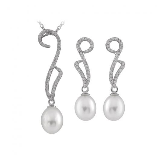 Sterling Silver pendant/17"chain with 7-8mm rice shape pearls and cubic zirconia with matching earrings.