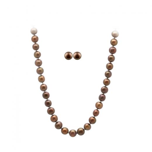 8-9mm chocolate pearl necklace & earrings, 14K.