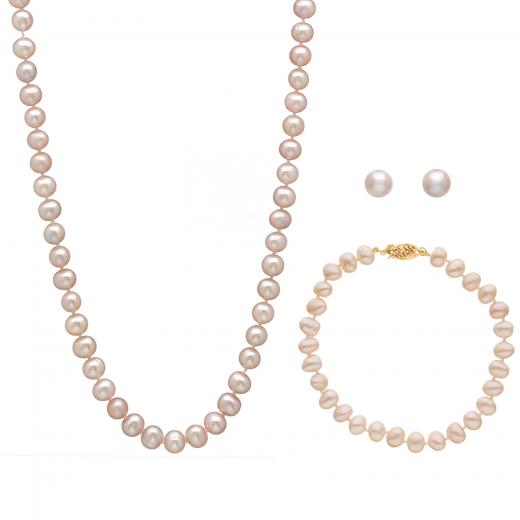 6-7mm pink freshwater pearl necklace with 14k clasp and matching bracelet and earrings.