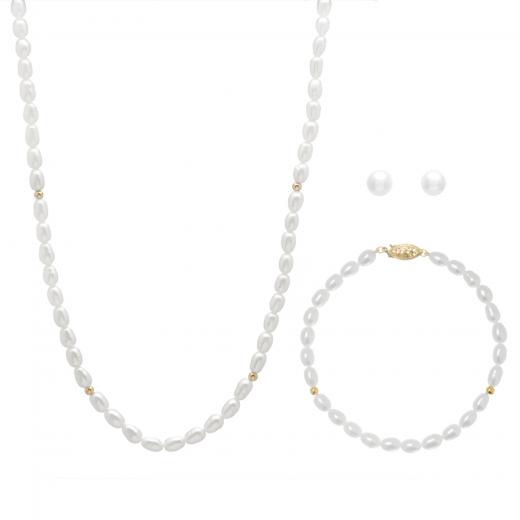 4-5mm white freshwater pearl necklace with 14k gold clasp and beads with matching bracelet and stud earrings.