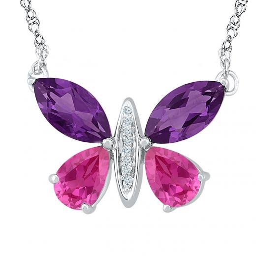 This vibrant butterfly necklace is crafted in lustrous sterling silver and features two marquise cut amethyst, two pear cut created pink sapphires and a shimmering body of diamonds. This gemstone necklace is sure to make a standout addition to any jewellery collection. Choose this shimmering piece either for yourself or as a special gift for someone you love.