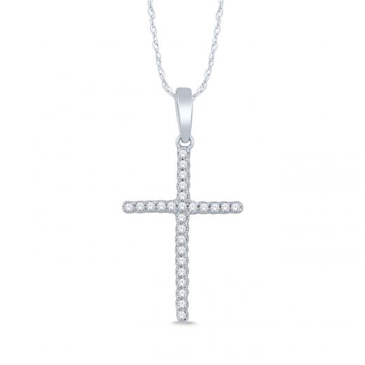 Declare your devotion with this diamond set cross pendant. Sculpted in shimmering 10kt white gold, this pendant hosts 0.05ctw of sparkling diamonds and is suspended from an 18" rope chain.