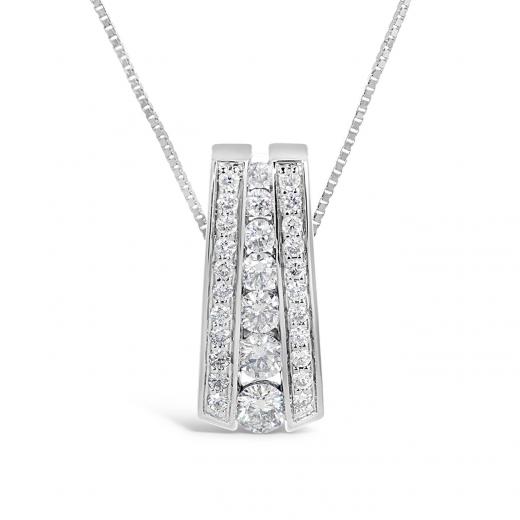 Rows of glittering round diamonds surround a line of graduated diamonds in this impressive 10kt white gold pendant. Boasting a journey design and 1.00ctw in sparkling diamonds, the pendant is suspended from an 18" box link chain.