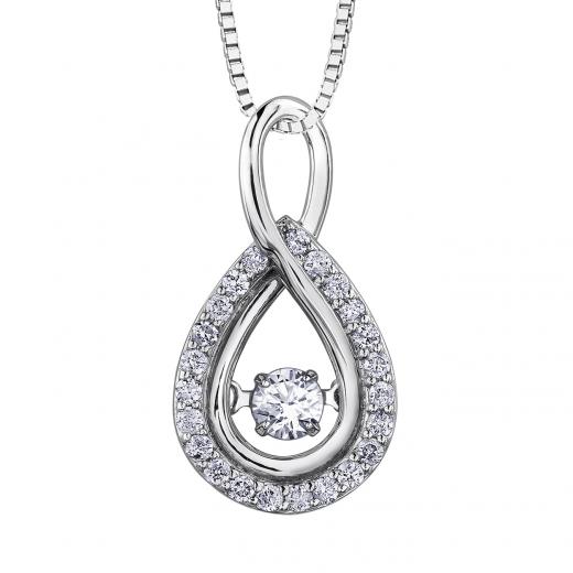 A diamond set tear drop enrobes an infinity symbol surrounding a Dancing Diamond in this ravishing pendant. The Dancing Diamond is an impressive 0.30ct and the tear drop is adorned with another 0.70ctw of round brilliant cut diamonds for a total carat weight of 1.00ctw. The pendant gracefully sways from an 18" chain. The perpetual motion of a Dancing Diamond will waltz to the beat of her heart.