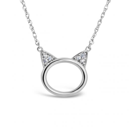 Purr-fectly petite this adorable stylized kitten pendant is a cute choice for a cat lover. Adorned with 0.03ctw of sparkling diamonds the split rope chain is 17" in length and secured with a spring ring clasp.