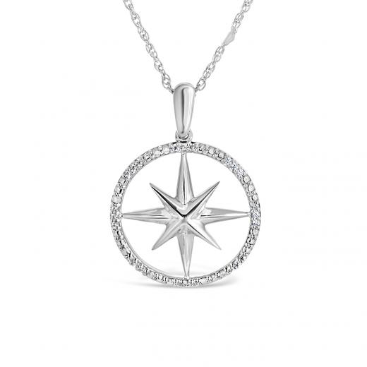 Cast in a glimmering sterling silver, this compass pendant is set with 0.06ctw of dazzling round diamonds. Suspended from an 18" rope chain with a lobster claw clasp, this pendant is a great gift for the intrepid traveller in your life.