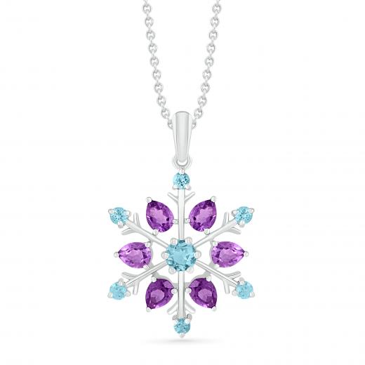 This icy-cold snowflake will warm even the coldest hearts! Crafted in sleek sterling silver, this festive flake is adorned with icy blue topaz' and warm amethysts. The pendant dangles from an 18’ chain with secure clasp.