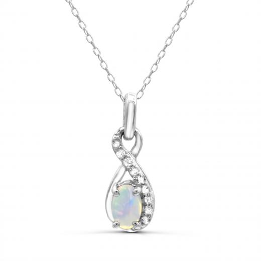 This modern yet classic, infinity design pendant is crafted in gleaming sterling silver and is sure to become a favourite item in your jewellery collection.  This item is perfectly adorned with shimmering white topaz and an oval cut opal, which is the birthstone for October. If you are looking for something stunning, order this for yourself or someone you love today!