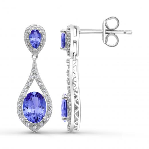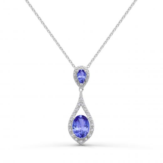 This stunning drop necklace features two gorgeous tanzanite stones and shimmering round white diamonds set in gleaming sterling silver. Add a touch of elegance to any outfit!