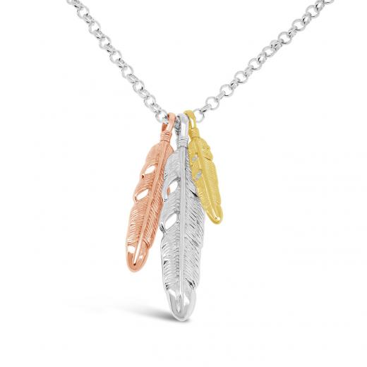 Feathers symbolize trust, honour, strength, wisdom, power, and freedom. This stunning pendant is crafted in sterling silver with accents of yellow and rose plating. Hung on a 24 inch chain, this piece is sure to become a favourite in your jewellery collection.