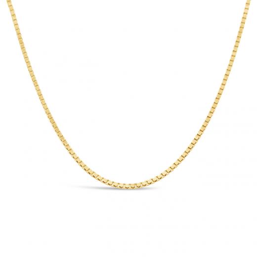 The box-style links create a smooth, structured design that catches and reflects light beautifully with every movement. The warm yellow gold adds a timeless touch of luxury, making this chain perfect for both everyday wear and special occasions. Its versatile design allows it to be worn alone for a refined statement or paired with a pendant for added flair.