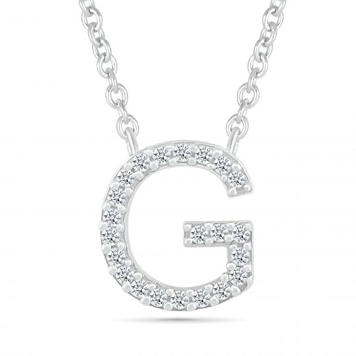This necklace features a sterling silver pendant shaped as the letter "G," embellished with diamonds that add a touch of sparkle and sophistication. The diamonds are delicately set to enhance the pendant's shine, while the sterling silver chain provides a sleek and timeless finish.