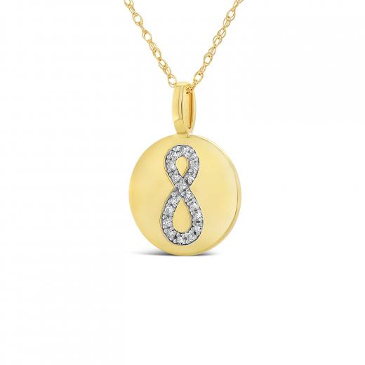 This pendant is a radiant expression of eternal connection, featuring a disc adorned with the timeless symbol of infinity crafted in lustrous yellow gold. The addition of diamonds adds a touch of brilliance, creating a piece that symbolizes enduring love and infinite elegance.