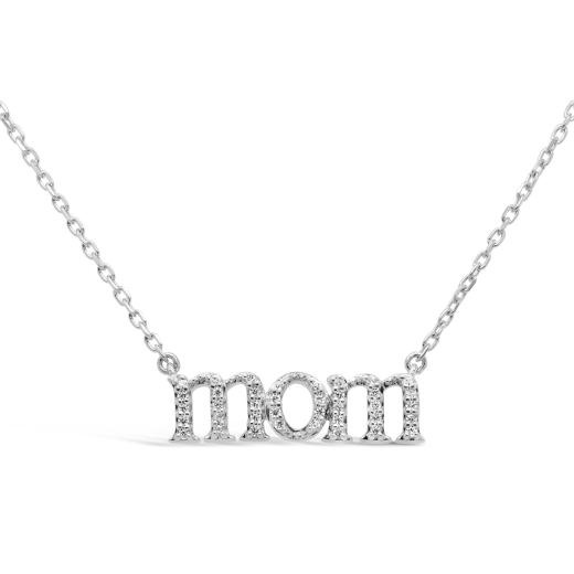This necklace features a heartwarming design crafted in sterling silver, with the word "Mom" adorned with a delicate diamond accent. The addition of the diamond adds a touch of brilliance, symbolizing the enduring and unconditional love that a mother provides.