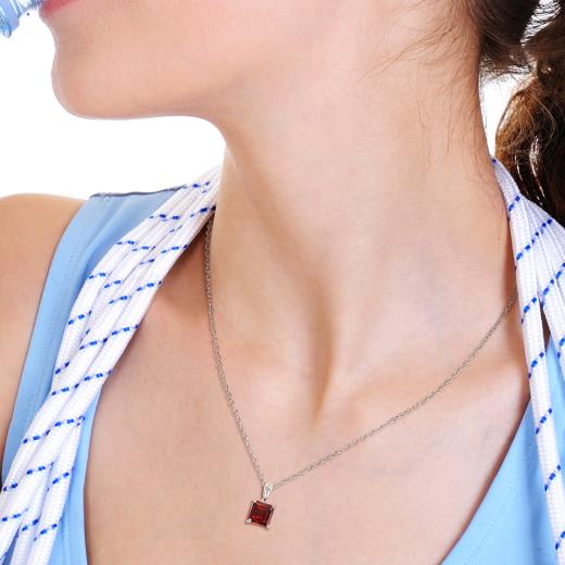 Bring in the new year with this charming Garnet Solitaire Pendant with Chain. Crafted in sparkling sterling silver, this exquisite pendant features a princess-cut, 4 prong-set garnet gemstone (6x6mm) in a classic basket setting. Polished to a brilliant shine, this appealing pendant is suspended on an 18-inch round cable chain secured with a spring ring clasp. This enchanting pendant will prove to be your lucky charm.