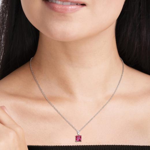 Show the world your love for elegance with this lab grown Ruby Solitaire Pendant with Chain. Crafted in sparkling sterling silver, this attractive pendant features a princess-cut, 4 prong-set lab grown ruby gemstone (6x6mm) in a classic basket setting. Polished to a brilliant shine, this mesmerizing pendant is suspended on an 18-inch round cable chain secured with a spring ring clasp. A must have in your collection of light jewellery.