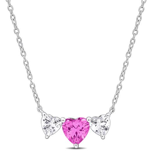 Elevate your style with our enchanting 2 5/8 CT TGW Created Pink Sapphire Triple-Heart Necklace in Sterling Silver. This exquisite necklace features a trio of hearts adorned with a total of 2.625 carats of created pink sapphires, arranged in a captivating and romantic design.Set in sterling silver, the necklace combines timeless elegance with a touch of modern flair. The delicate and feminine design makes it a perfect accessory for adding a touch of glamour to both casual and formal outfits.Celebrate love and beauty with our Created Pink Sapphire Triple-Heart Necklace. This piece is a symbol of sophistication and a radiant addition to any jewelry collection.