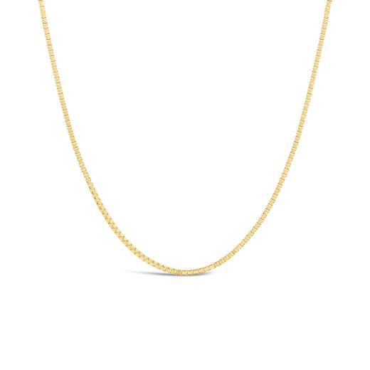 This 18K Yellow Gold box chain is the epitome of understated elegance. At 0.8mm wide and 18 inches in length, its delicate design adds a refined touch to any ensemble. The intricate box link pattern ensures it catches the light beautifully, making it a versatile piece that can be worn alone or paired with your favorite pendant.