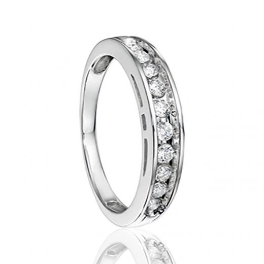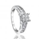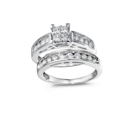 A quartet of sparkling princess cut diamonds is showcased in this breathtaking diamond princess engagement ring. Brilliant round diamonds are channel set along the side of the gleaming 14k white gold band. The matching wedding band features additional bright round channel set diamonds for added brilliance. This princess diamond bridal set has a total diamond weight of .50 carats.