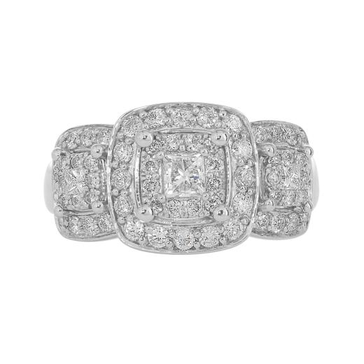 This modern 14k white gold diamond ring charms with magnificent sparkle. Crafted with a three-stone clustered design, this 1ctw ring features a princess cut diamond at the centre of each cluster, with a squared double halo.