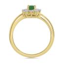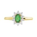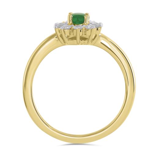 Crafted in 14k yellow gold, this stunning ring features an oval shaped emerald at the crown with a halo of diamonds intricately placed around it. The perfect gift for yourself or the emerald lover in your life.