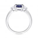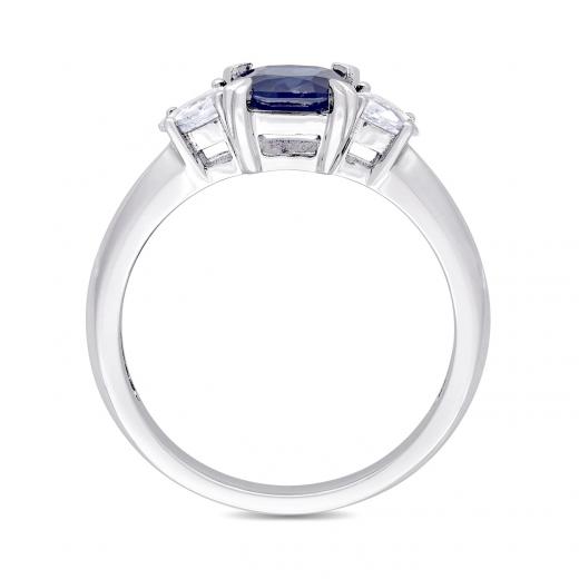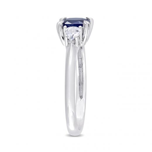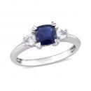 Add a royal appeal to your wedding outfit with this Blue and White Sapphire Three-Stone Engagement Ring. Crafted in luminous white gold, this gleaming engagement ring features a cushion-cut, prong-set vibrant genuine sapphire gemstone (6 x 6mm) at the center, with a pear-shaped, prong-set twinkling white sapphire (4 x 3mm) on each side. Enhanced with a high-polish finish, this sapphire ring is an ideal piece of jewelry for an occasion and is sure to make her shine on her wedding day.