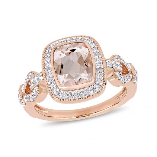 This intricately-detailed loop halo gemstone ring is crafted in 10-karat rose gold and features a cushion-cut, bezel-set morganite gemstone at the center of its 66 round-cut, pave-set shimmering diamond halo design. This distinctive design truly captures the trends of the moment, coupled with a timeless look and feel. Whether worn as an engagement ring or simply a lovely new gemstone piece, this ring is a perfect addition to any jewellery collection.