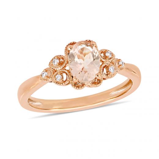 This enchanting vintage-inspired morganite and diamond engagement ring is crafted in glistening 10-karat rose gold and features an oval-cut, prong-set morganite at its center along with six round-cut, prong-set diamonds adding a hint of shimmer to its intricately-detailed design. The classy milgrain detailing and high polish finish gives the ring a stunning look. This ring is a perfect choice for today's contemporary woman looking for something unique.