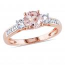 This delightful ring feature a round-cut morganite center stone and created white sapphires side stone with accenting round white diamonds . The fantastic ring is crafted of 10-karat rose gold with a high polished finish.