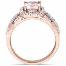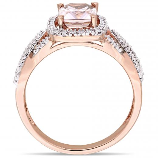 This pretty ring features a round-cut morganite center stone with diamond side stones set on a braided design. The ring is crafted of 10-karat rose gold with a high polish finish.